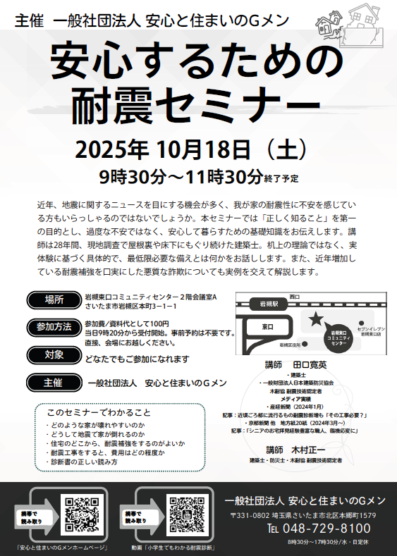 無料セミナー開催のお知らせ│10月18日(土)安心するための耐震セミナー@さいたま市